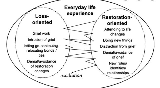 Researchers Dr. Margaret Stroebe and Dr. Henk Schut developed the Dual Process Model of Coping with Bereavement (2010). They propose that bereaved individuals oscillate between loss-oriented and restoration-oriented responses as they cope with loss.